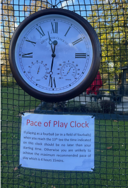 I have had a number of competition players commenting in recent weeks about the slow pace of play on Saturday mornings, which now seems to have become the norm at around four hours and thirty to forty-five minutes or more. I’d like to ask every player to be aware of the time taken in their own groups and to be aware of other groups in front and behind. I’d rather not plaster the course with notices on pace of play or marshalling but four hours fifteen minutes is the timescale for a four ball, so I’d ask everyone to try and keep up or better this pace. There is the first new time clock in situ at the 13th by the hut so this will give you an indication if your group is keeping up with play, in addition to times marked on the scorecards. Please check into the Pro Shop before play - you will note there is start and end time on scorecards so, please complete both sections to help with course monitoring. There have been more drastic measures suggested but again I’d like to ask members to respect the competitors, competitions, and etiquette of the Club when playing, particularly at peak times.